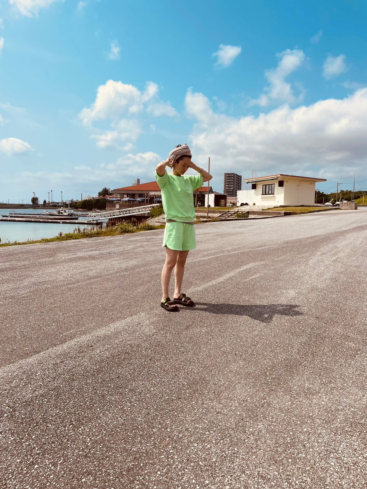 青空に映えるグリーンのセットアップ姿で佇む島袋さん。すごく健康的!