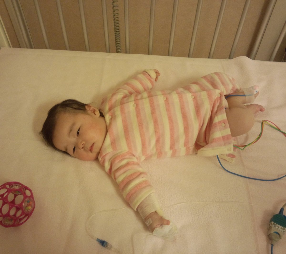 オペ前に友だちが作ってくれた3000羽鶴と一緒に。1歳の萌々花さん