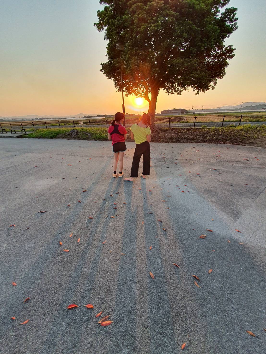 夕日に黄昏れるお子さんたち。広大な田園が広がる
