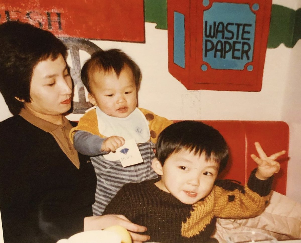 両親が離婚前。ピースをする河井さん、母と弟と。