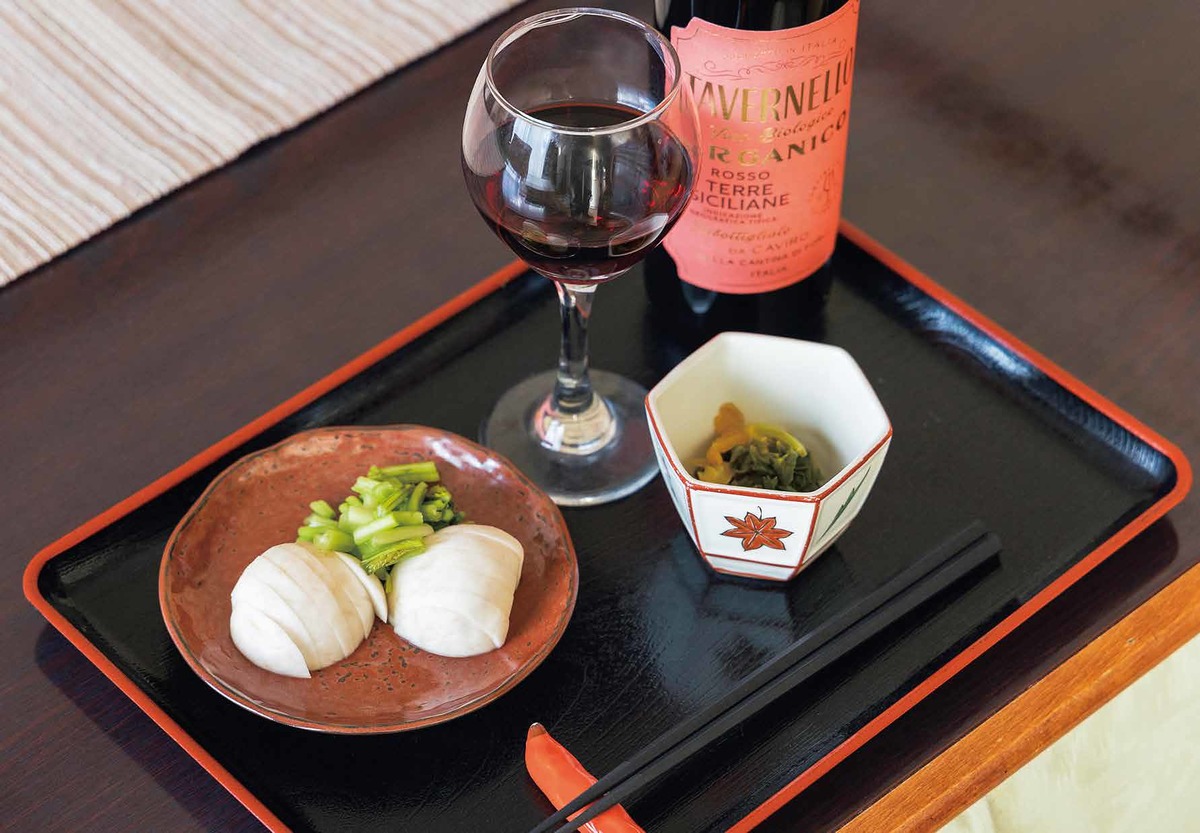 この日の晩酌のお供は、自家製ぬか漬けとセロリの和え物。お盆に盛りつけて、ちょこちょこ食べながら飲む時間は至福のひととき