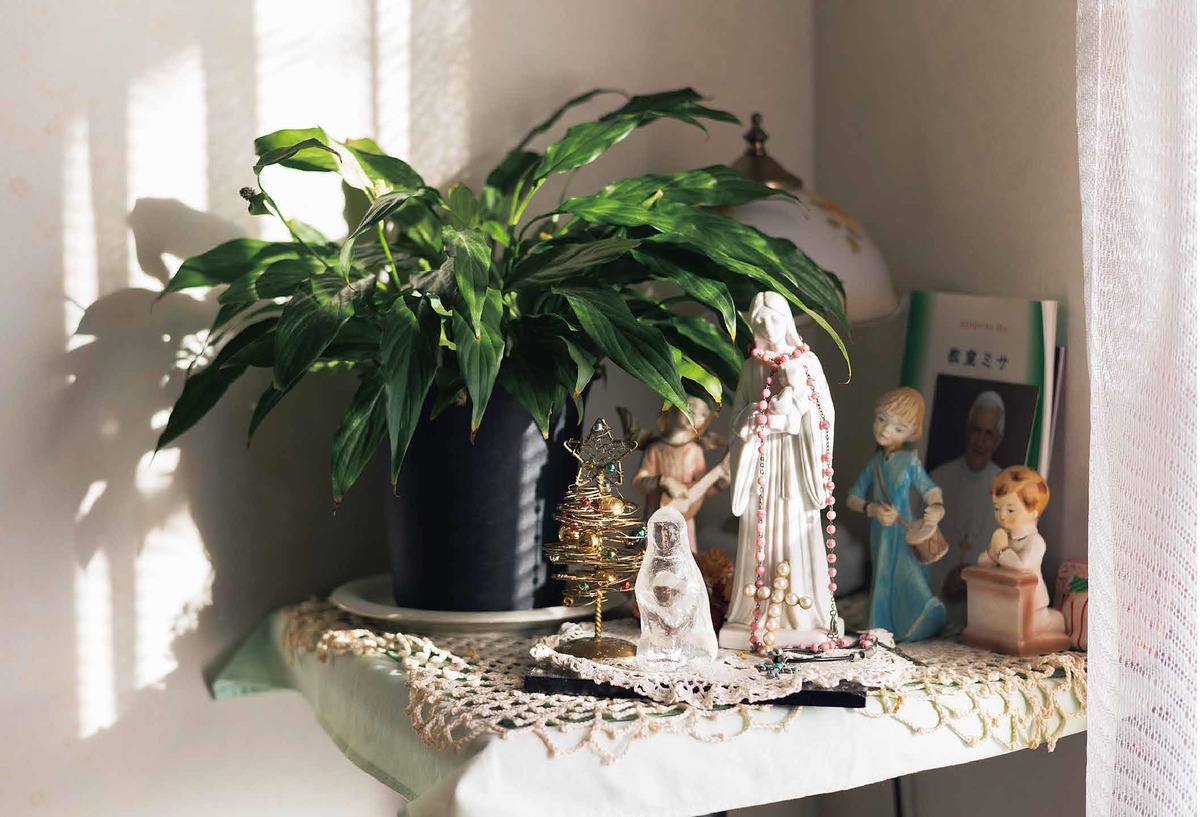 60歳の頃、洗礼を受けてクリスチャンに。ダイニングのコーナースペースを祭壇にしている