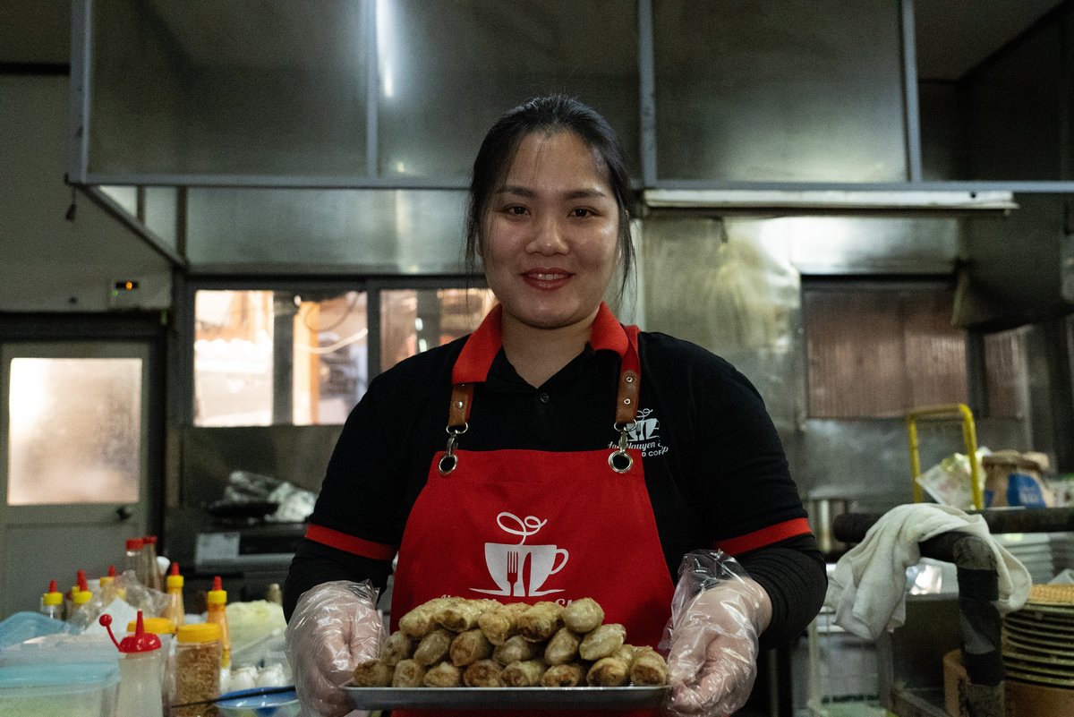 出来立ての揚げ春巻きを持つグェンさん。フォーとともに店の人気メニューだそう