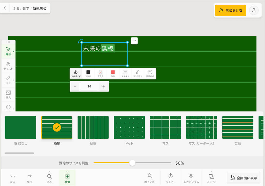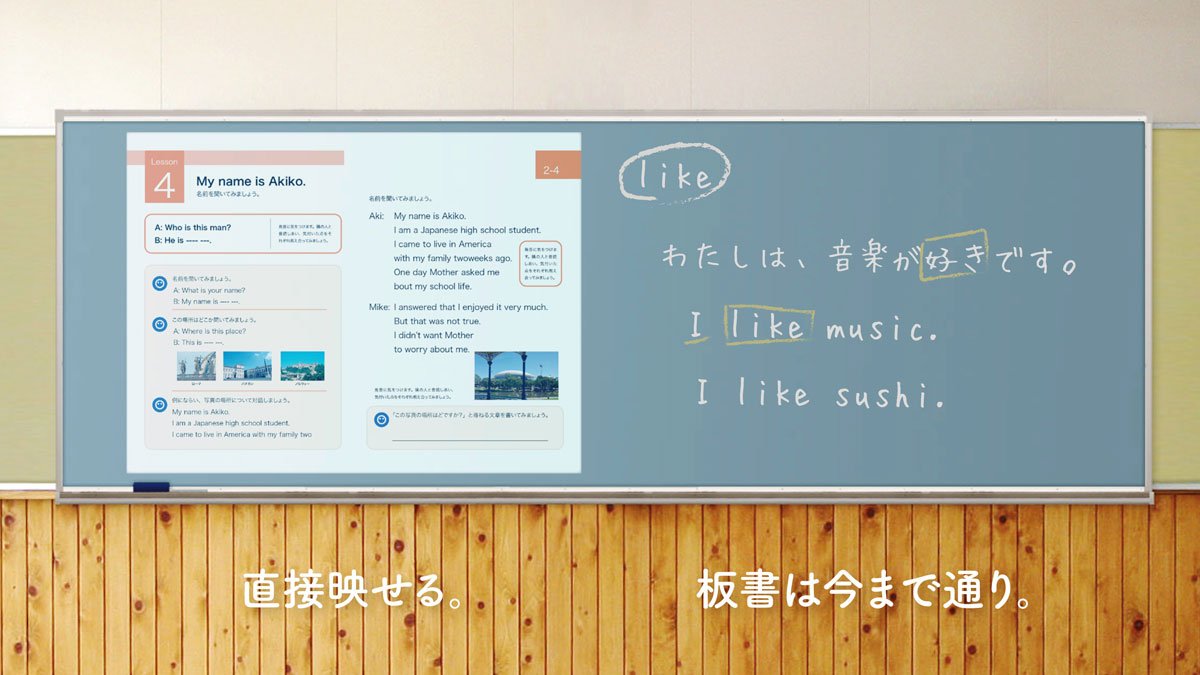 黒板専用プロジェクター「ワイード」使用の例。国語では右から板書、英語・数学では左から板書できるよう、フレキシブルな投影を可能に
