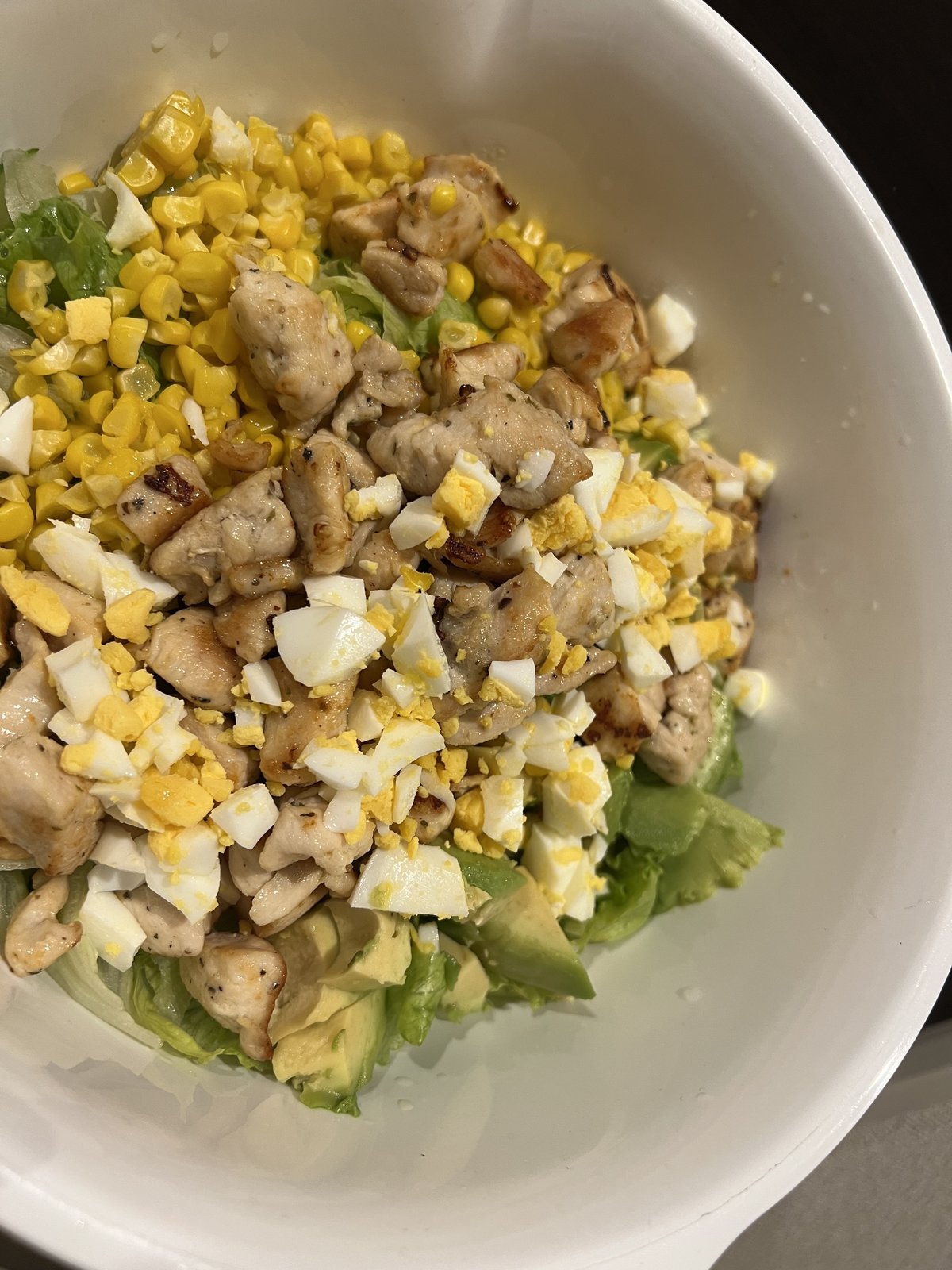 鶏胸肉に卵やレタス、コーンを使ったダイエット中の定番メニュー