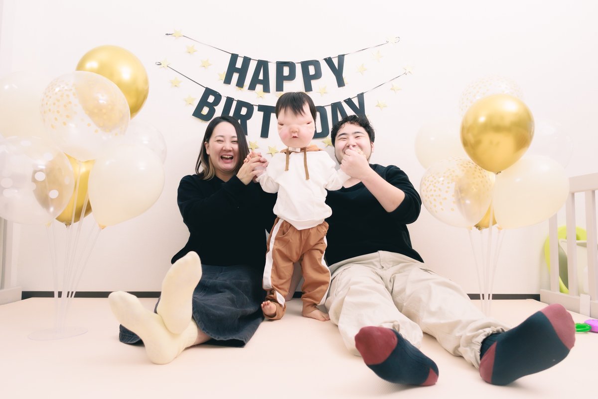 2歳の誕生日のお祝いの記念フォト左から星野しほさん、未来くん、孝輔さん