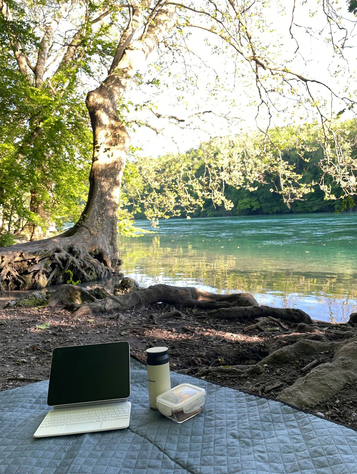 緑がある場所にいると気持ちが上向くと脳科学的に示されているため、自然の中で仕事をすることも