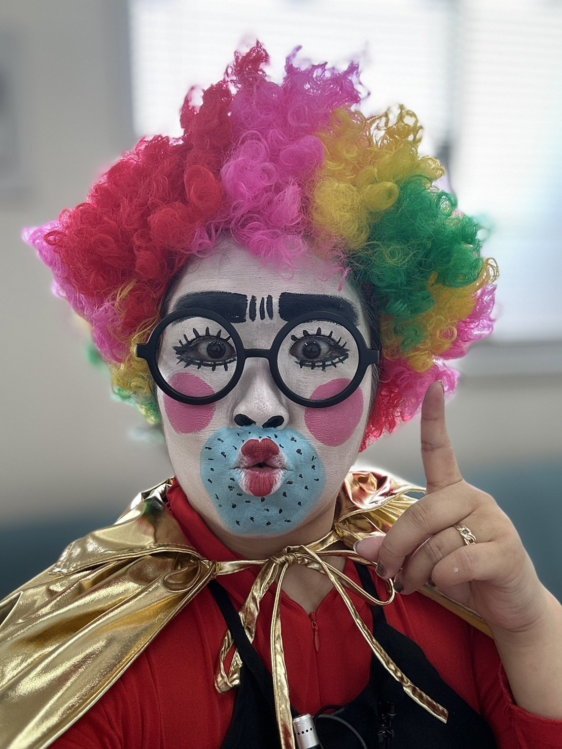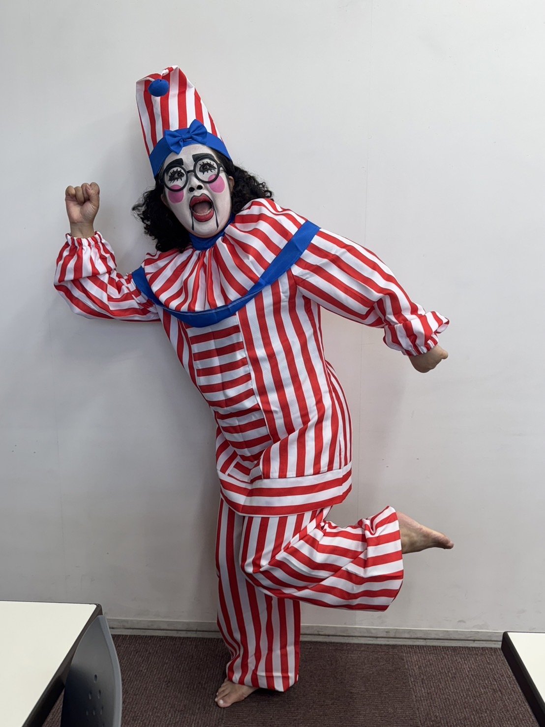 講演会ではユーモアあふれる衣装とメイクで登場し、来場者を笑顔にさせる