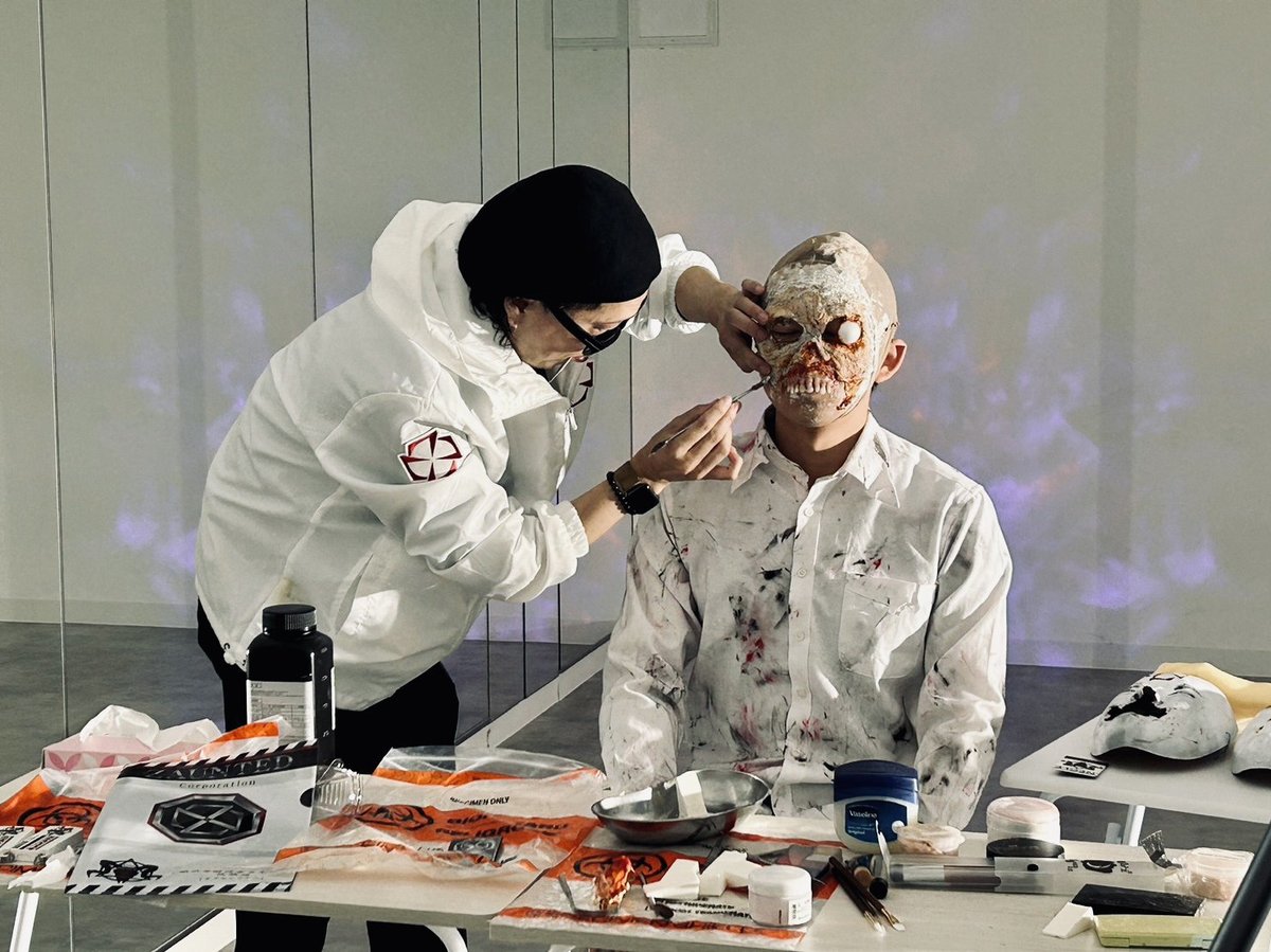 肌をマスクで覆うタイプのホラーメイクを施すマイケルティーさん