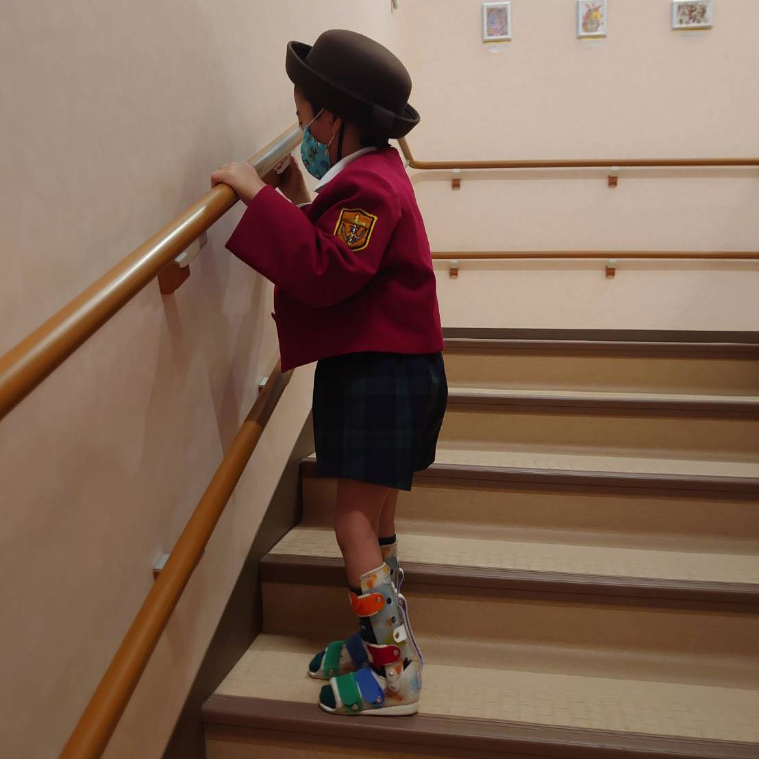 幼稚園の手すりを使って階段をのぼる息子