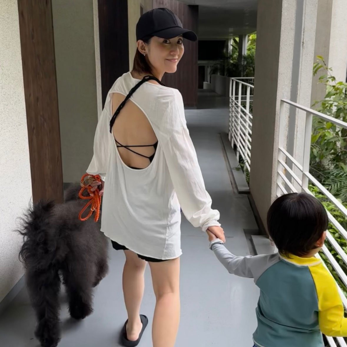 旅先で背中が綺麗に開いたカットソーを着て家族で外出