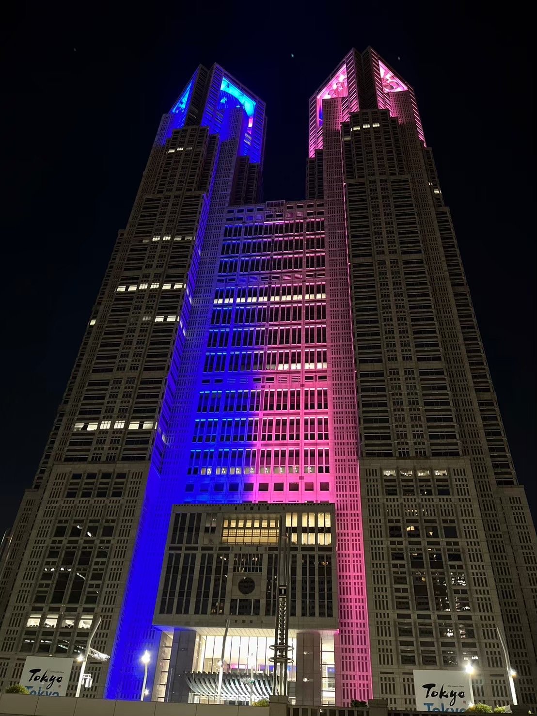 ピンク&ブルーリボンのシンボルカラーにライトアップされた東京都庁