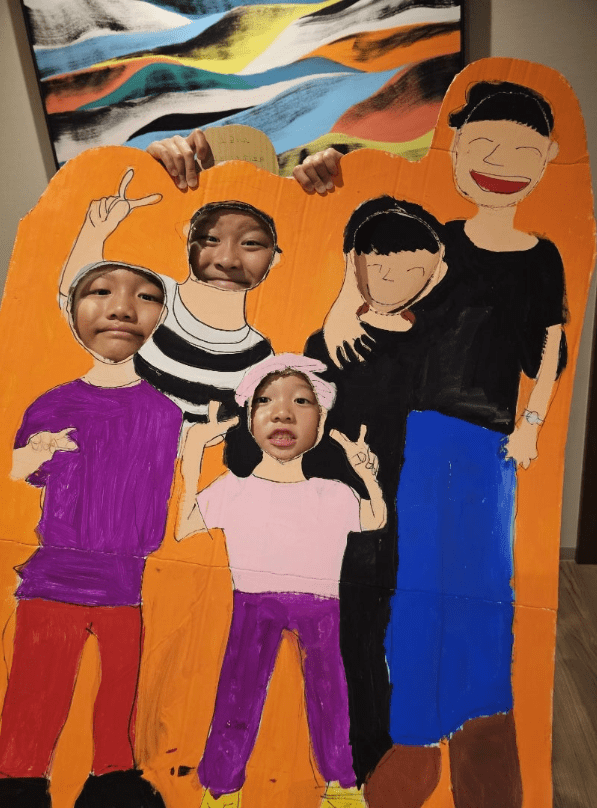 次男せいはち君が制作した家族作品に顔はめする(左から次男せいはち君、長男せいきち君、長女こうめちゃん)