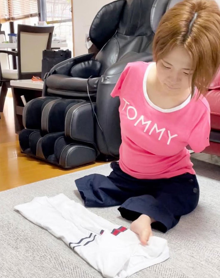 現在は1児の母として家事をこなし、洗濯物は足で畳む佐野さん