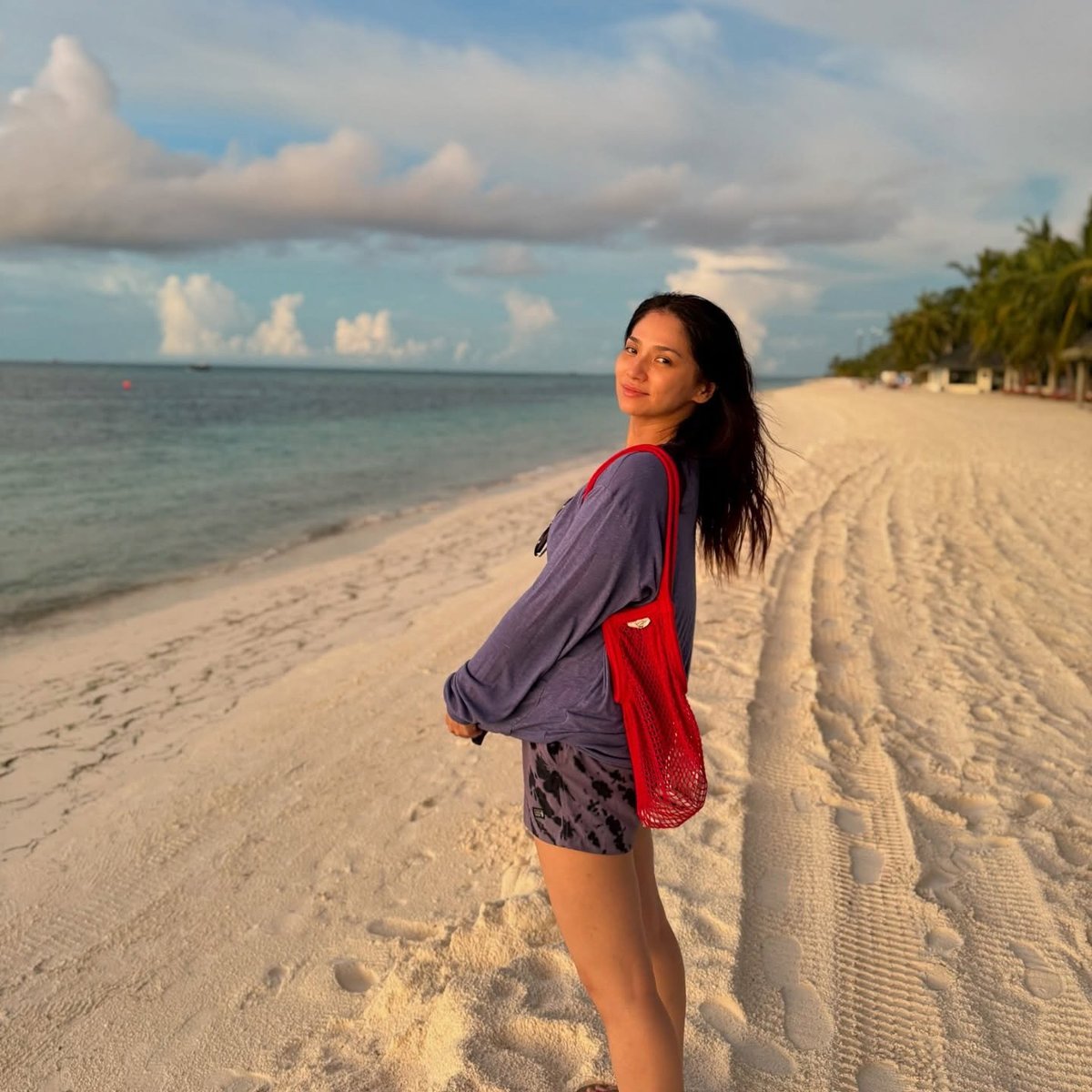家族で訪れたモルディブのビーチで美しい夕日を眺める野波さん