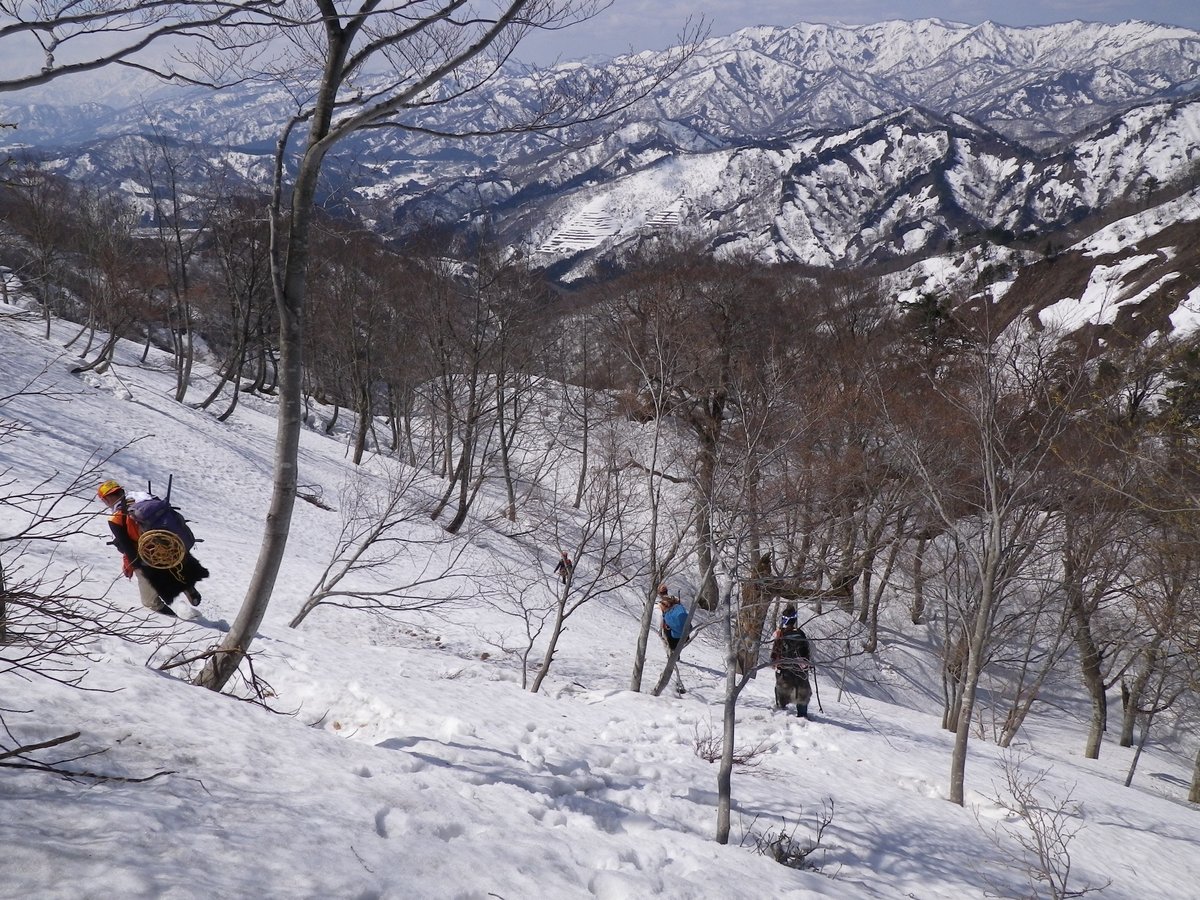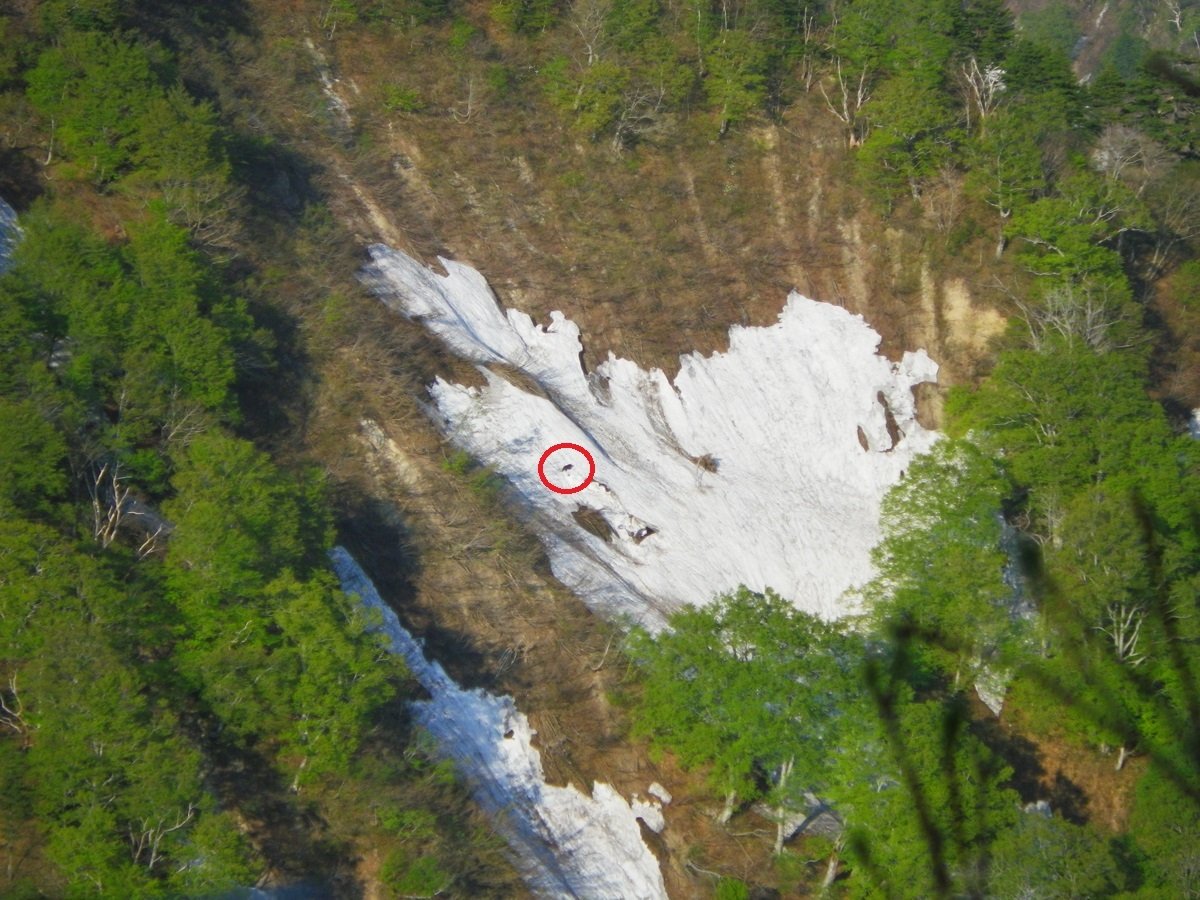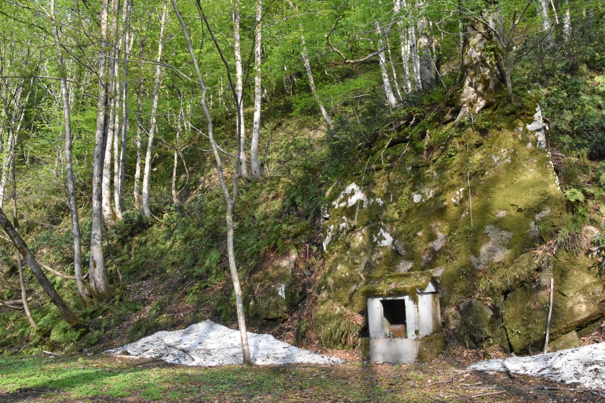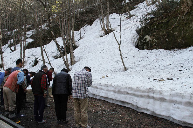 狩りの前に全員で山の神の祠(写真右上)に参拝する