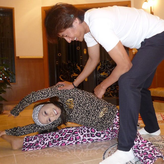 自宅で夫婦仲よくストレッチする2人