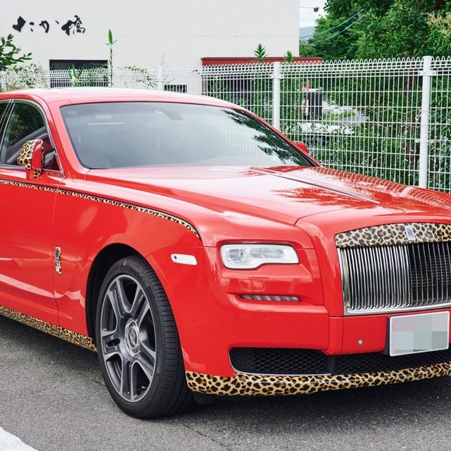 真っ赤な車もヒョウ柄を忘れない