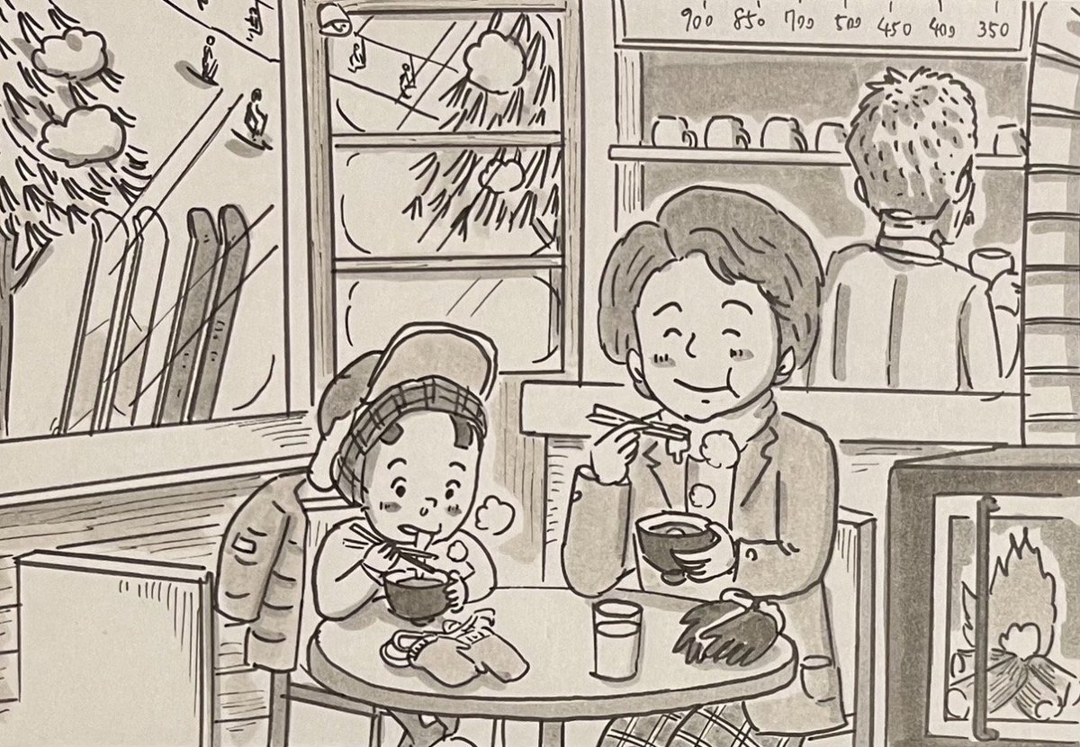スキー場の喫茶店でおしるこを食べる鉄拳さんとお母さん