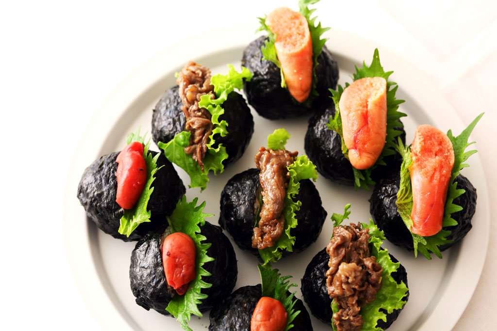 3個にレタスと牛肉、3個に大葉とたらこ、削り節を混ぜた3個に大葉と梅干しをはさむ。