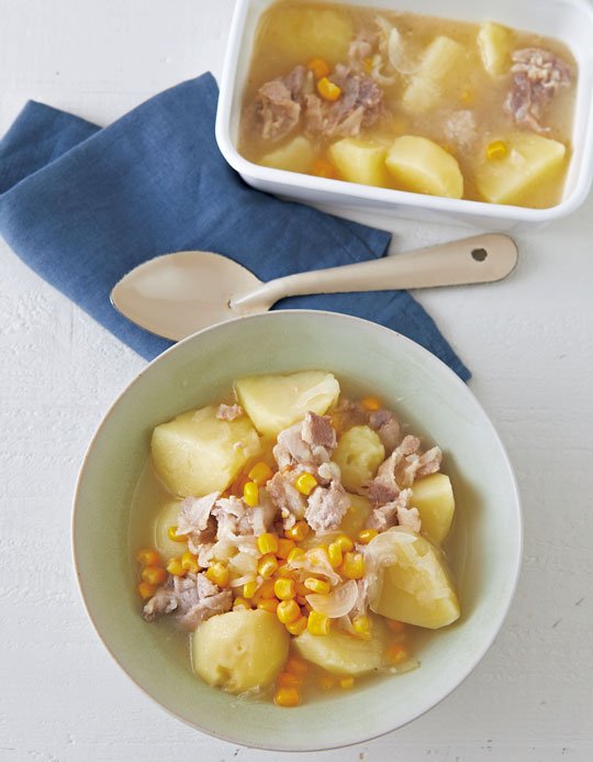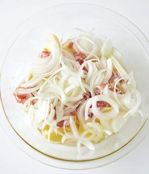 直径26㎝の耐熱ボウルに、水けをきった新じゃが、豚肉、玉ねぎの順に広げ入れる。混ぜたBを加え、ふんわりラップをかけて600Wの電子レンジで20分加熱する。