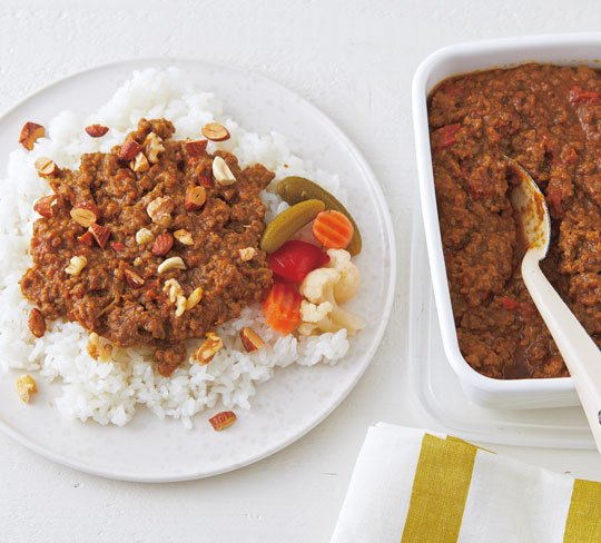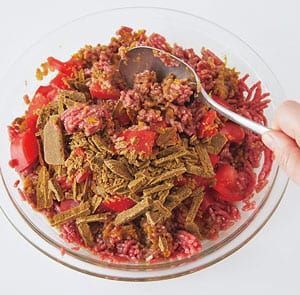 直径25㎝の耐熱皿にひき肉を入れ、Aを加えて、スプーンなどでよく混ぜる。2㎝角に切ったトマト、粗く刻んだカレールウを加えて、さらに混ぜ合わせる。
