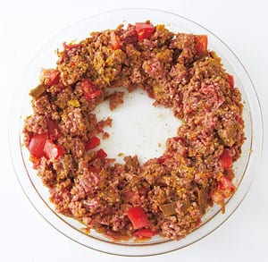 ①を、まん中をあけてドーナツ状になるよう広げる。ふんわりとラップをかけ、600Wの電子レンジで10分加熱する。とり出して、トマトをつぶすようによく混ぜ合わせる。