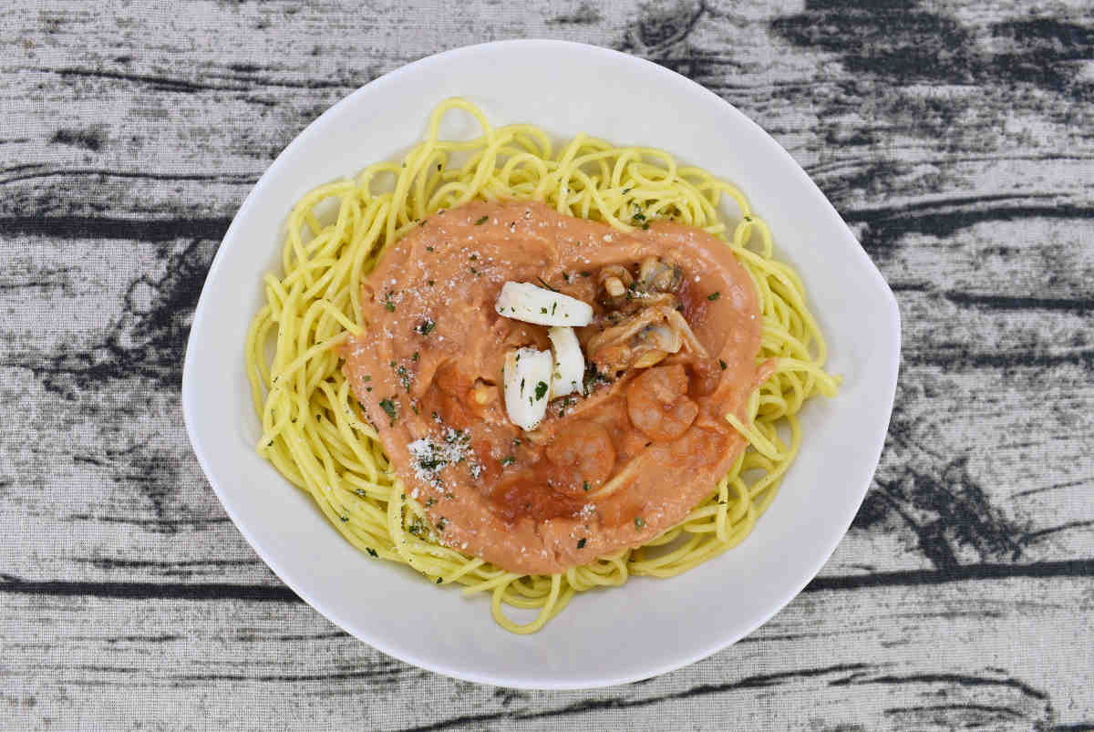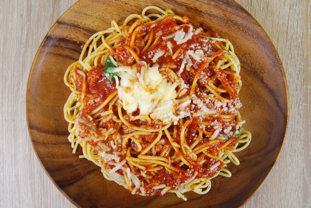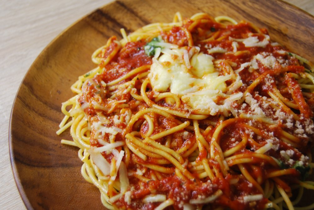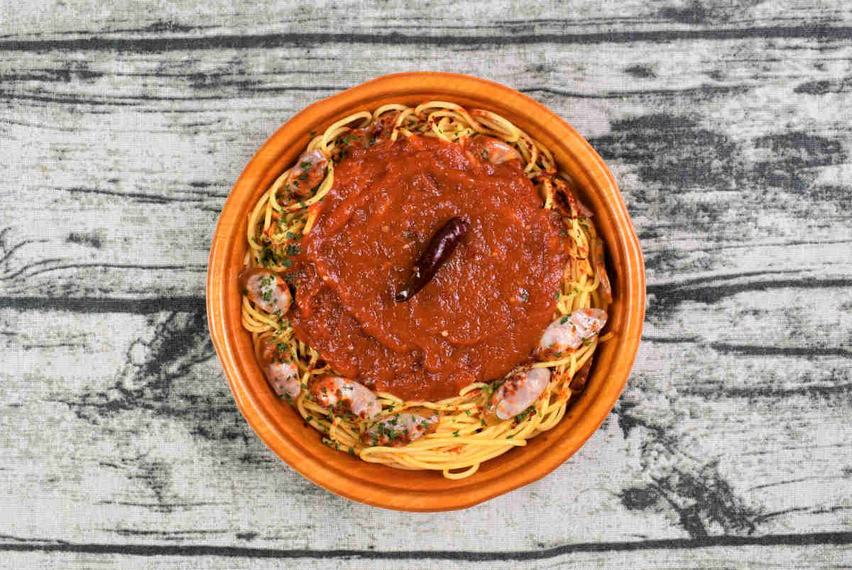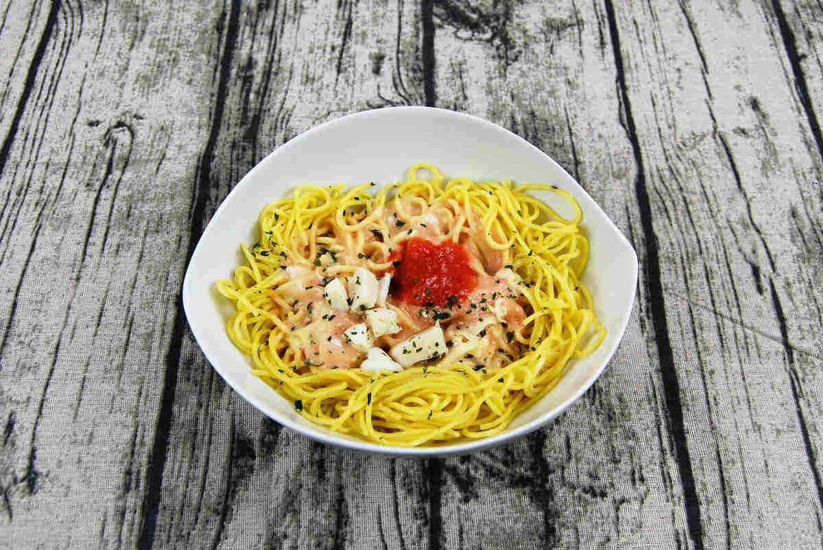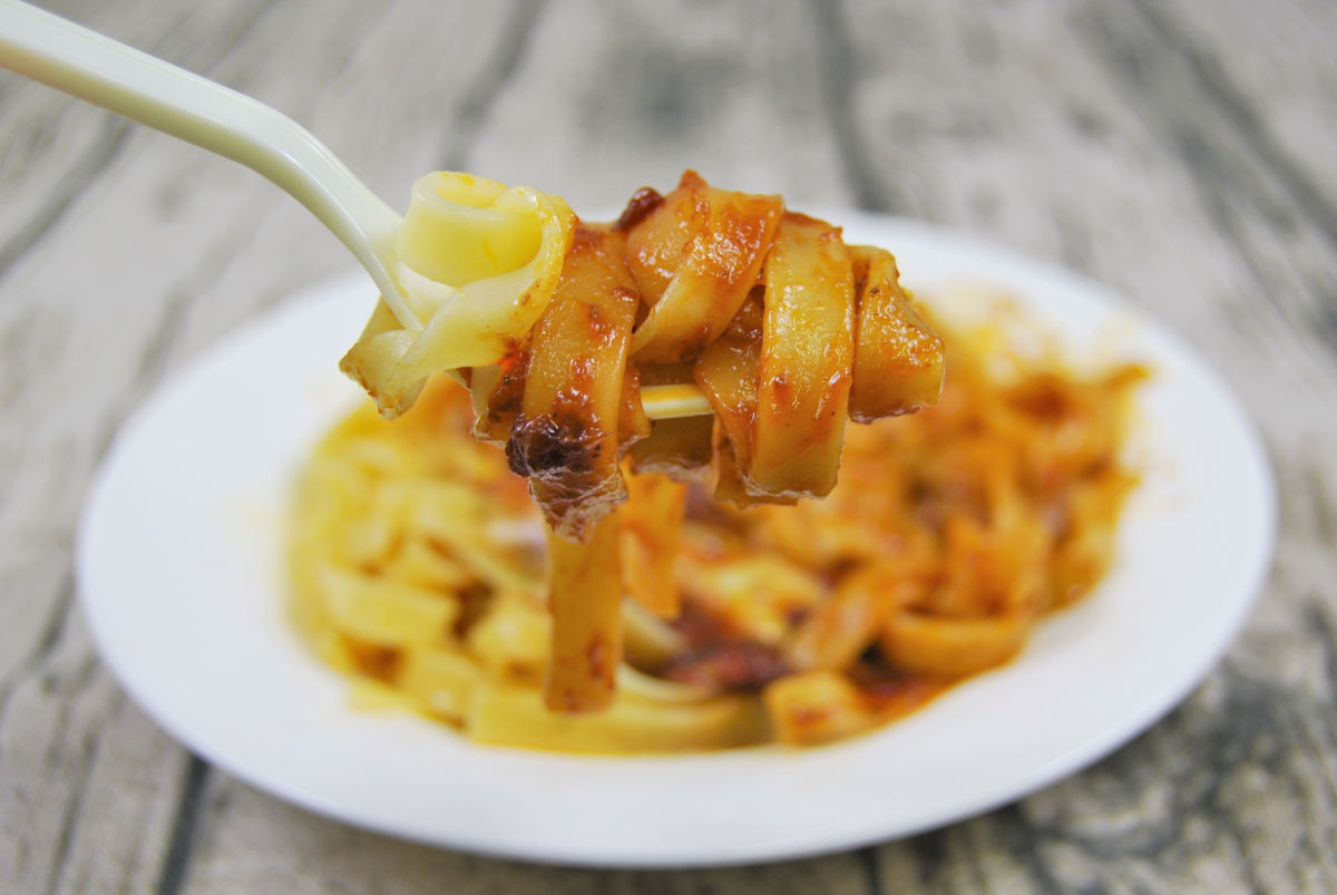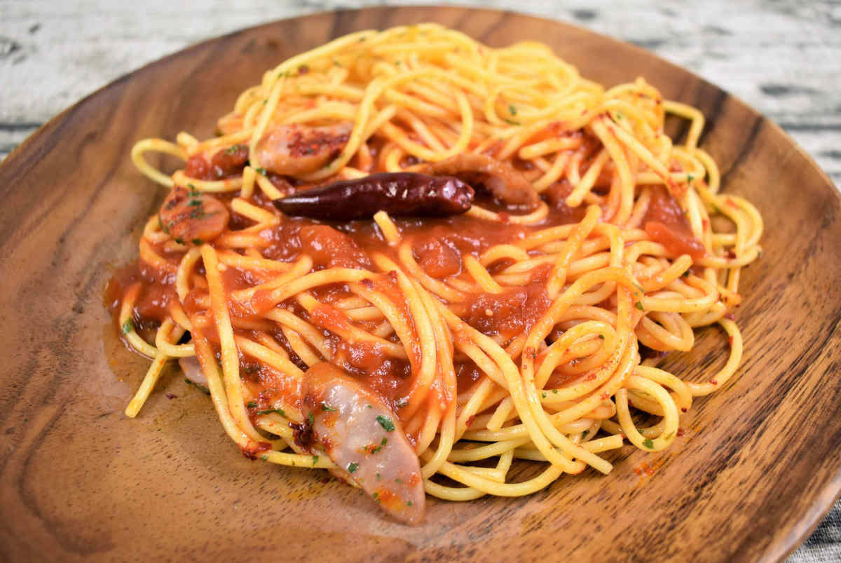 相性がよいのは、トマトソースとパスタだけではありません。ウインナーとパスタを一緒に食べると、スモーキーな香りがにんにくの風味を引き立てます。中央のカイエンペッパーは、少しかじるだけでも辛さが倍増。辛味をパワーアップさせたい時に、トマトソースと絡めて食べるのがおすすめです。