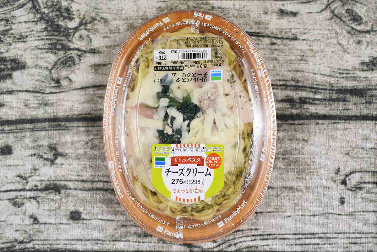 お次に紹介するのは、ファミマ「リトルパスタ チーズクリーム」(税込298円)。先ほど紹介したファミマ「リトルパスタ ナポリタン」と同じシリーズの人気パスタです。濃厚チーズの味わいに注目しつつ、さっそくレビューしていきましょう。