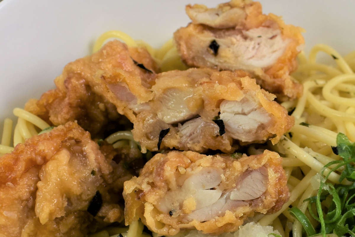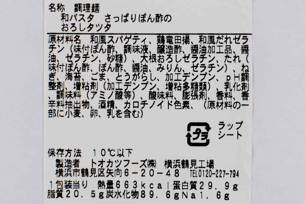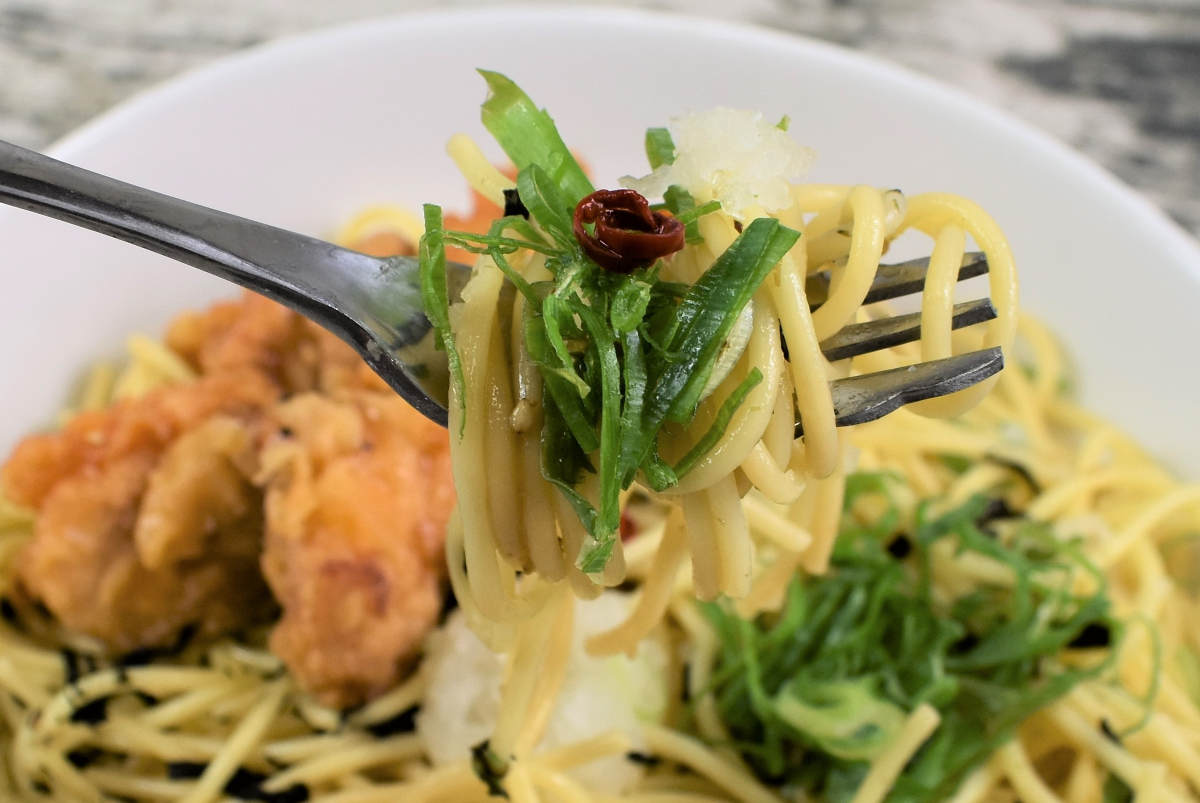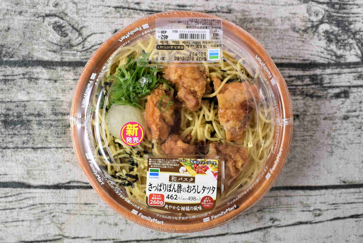 ファミマの「和パスタ さっぱりぽん酢のおろしタツタ」(税込498円)は、和風パスタの上に竜田揚げがトッピングされた、ボリュームたっぷりのパスタです。それでは、さっぱりぽん酢がアクセントになった「和パスタ さっぱりぽん酢のおろしタツタ」をさっそくいただきます!