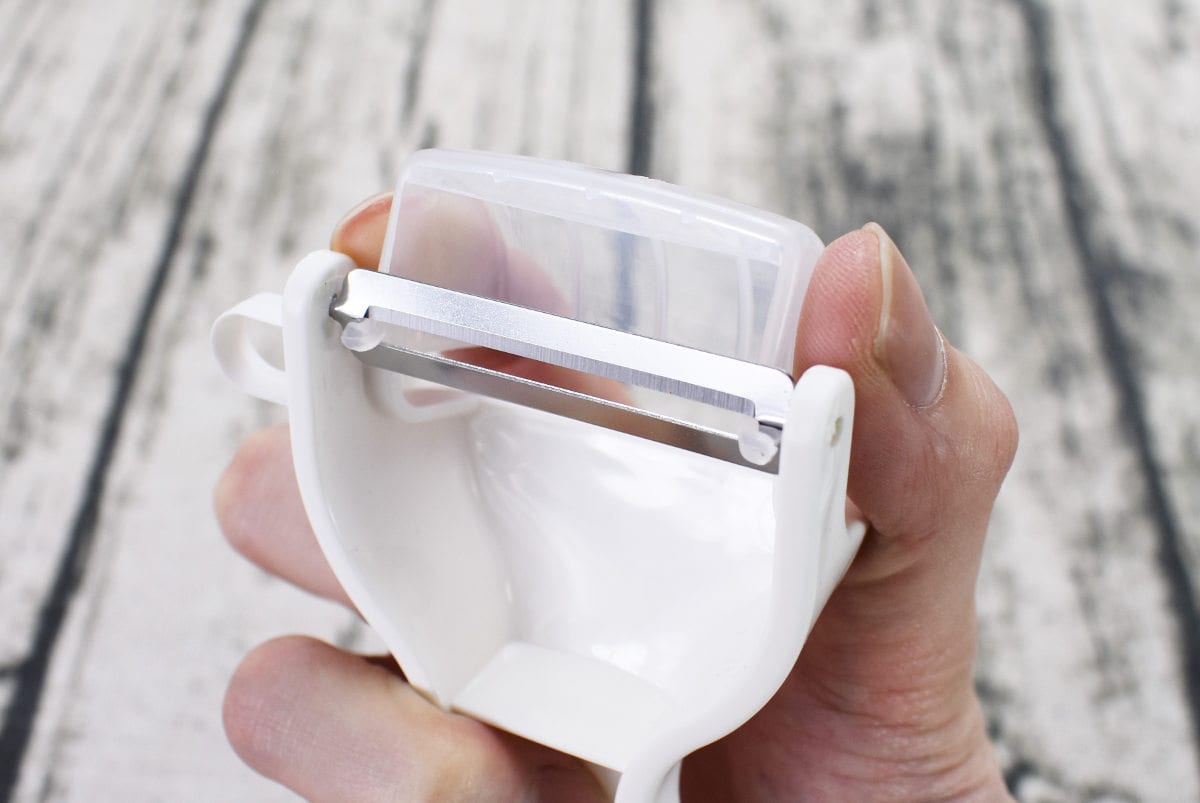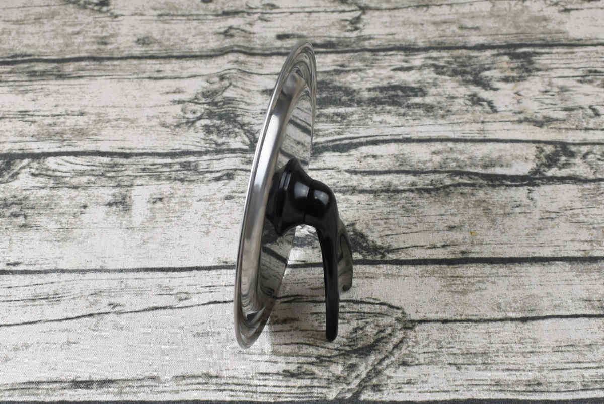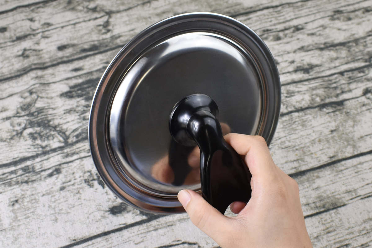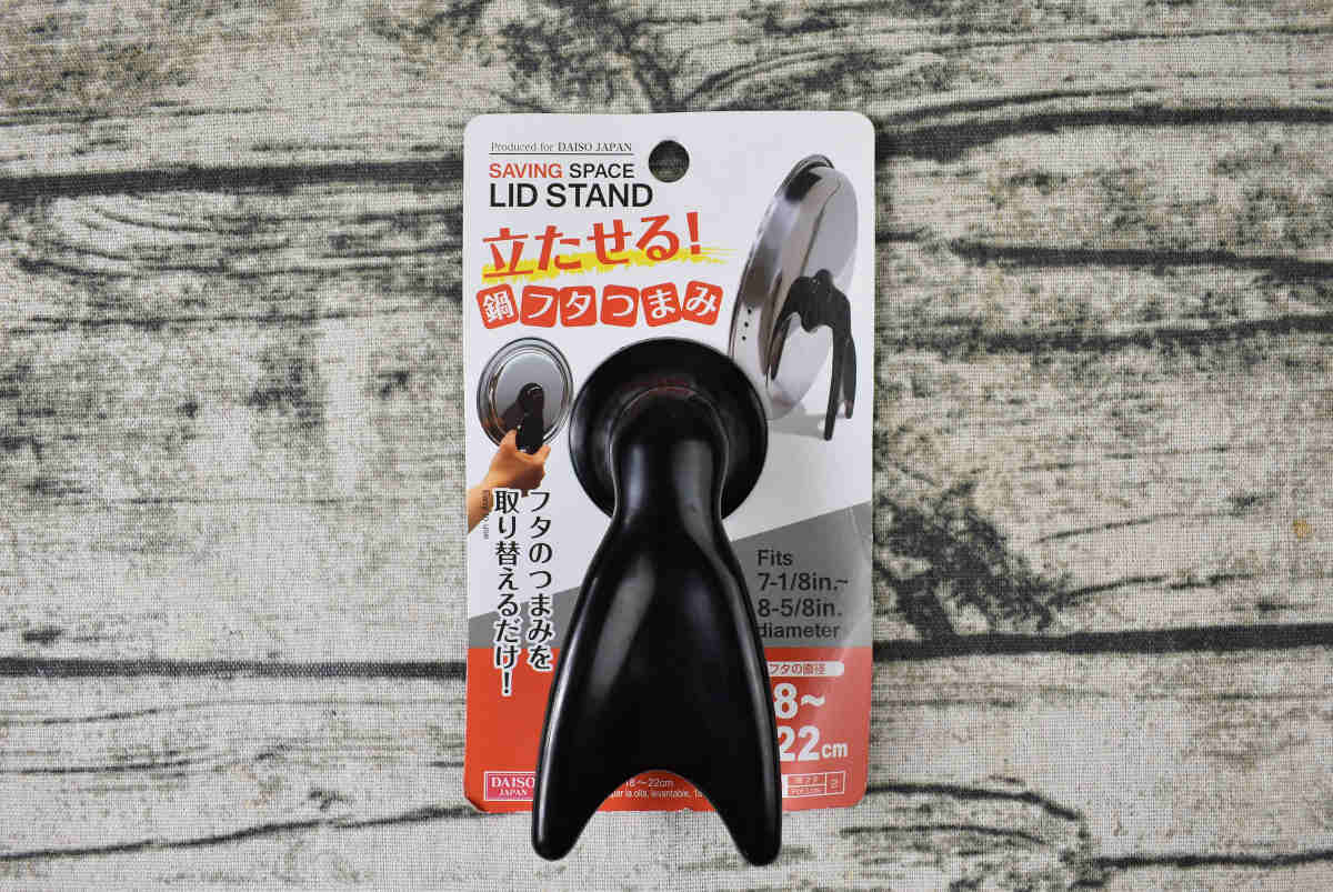 次にタテ向きにして床に置き、鍋フタが立つのか検証します。実際に置いてみたところ、持ち手がフタを支えて自立しました!フタを支える床と接地した部分は幅広く、バランスが安定して倒れる心配もありません。これならフタを置く場所が少なくて済み、調理スペースが拡がりそうです。