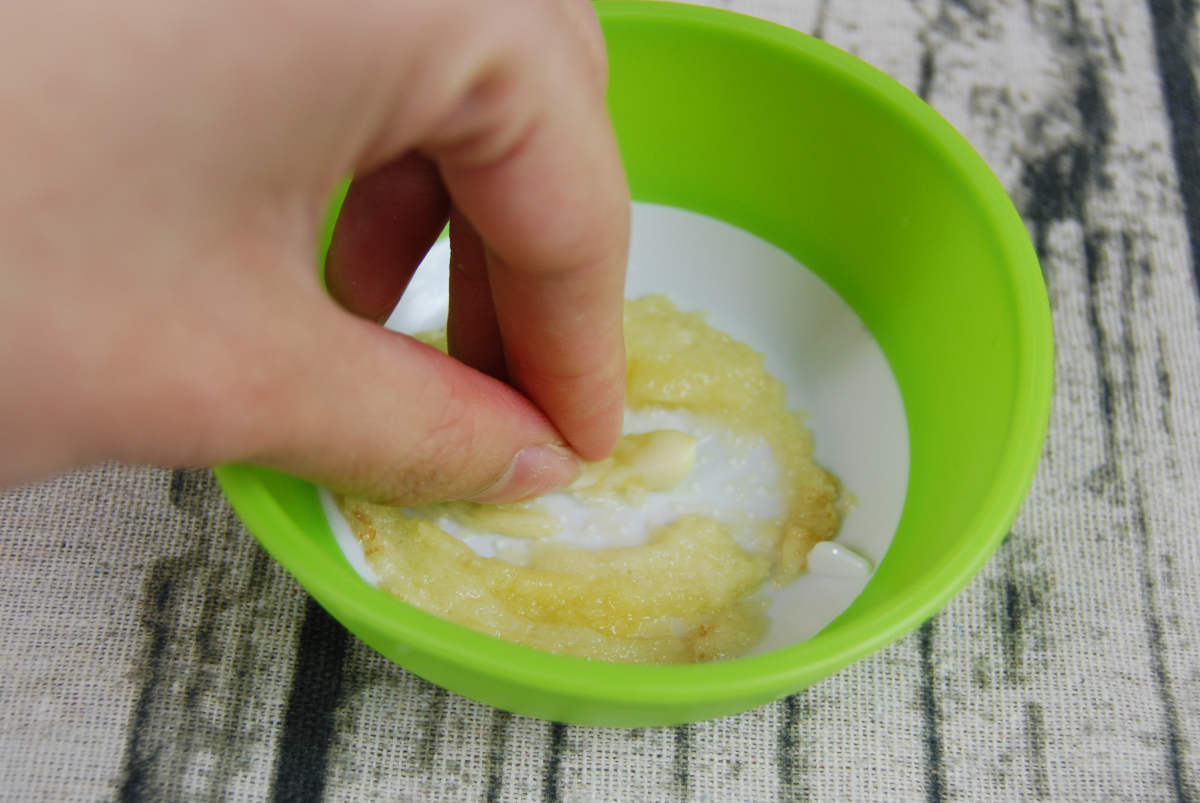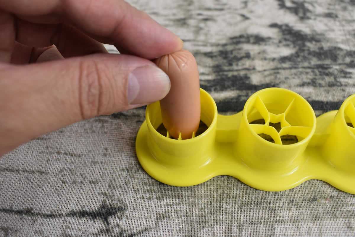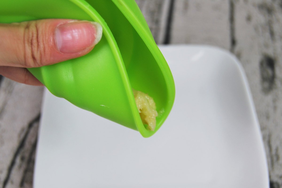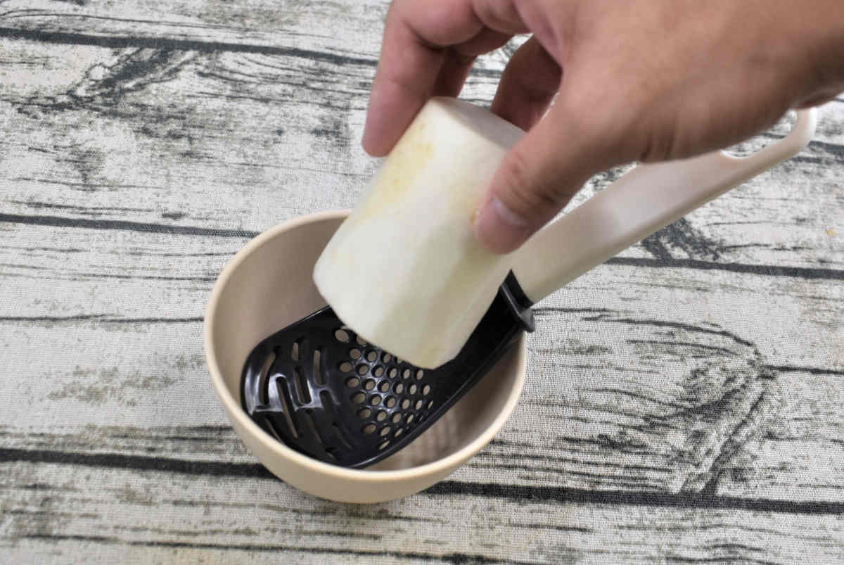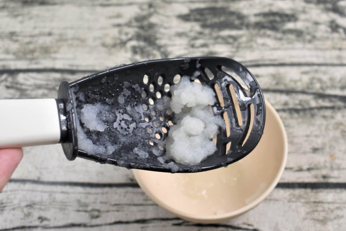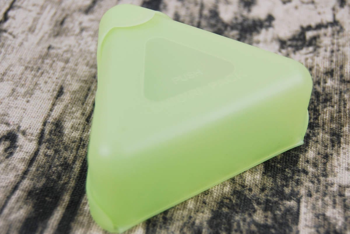 早速蓋を開けて、昨晩の残りご飯を詰めていきましょう! ご飯を詰めようと手のひらに乗せた瞬間、プルプル震え出した「簡単おにぎりパック 大」。無理にご飯を押し込むのではなく、しゃもじを使って優しく“ふんわり”とご飯を詰めてあげてくださいね。