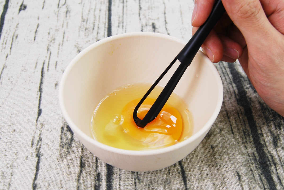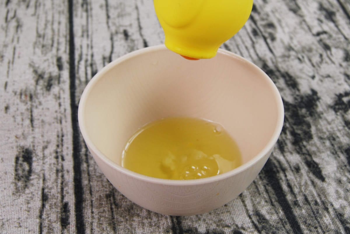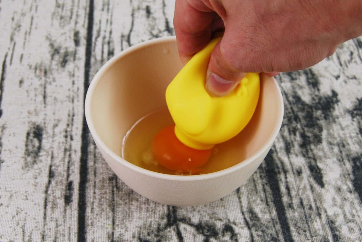 持ち上げると、たまごの黄身がお尻から少し顔を覗かせています。白身が多少混入してしまっても、そのまま持っていれば流れ落ちていくので心配は不要。産卵中のような見た目のニワトリを別の容器に移動して、黄身をとり出しましょう。