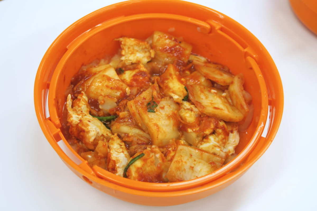 ▲通常の豚キムチは焼いて加熱するが、タクックの場合は蒸気で加熱するので、肉が固くなりにくい。