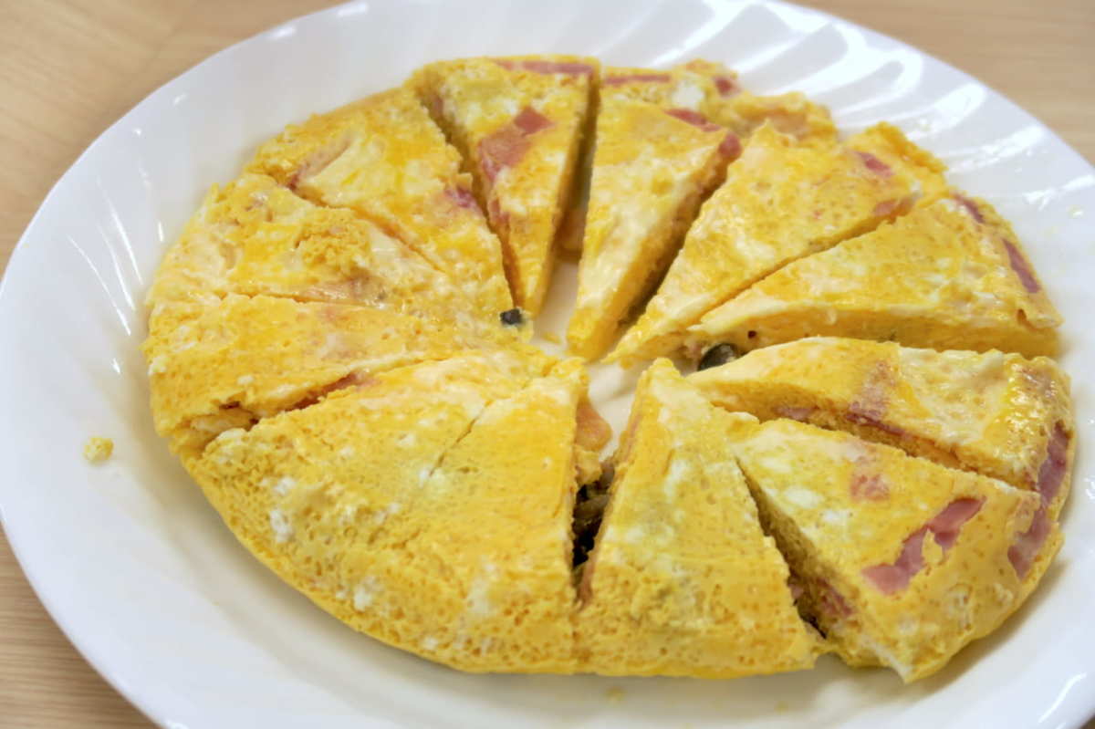 ▲キッシュはクッキングプレートでこしょう、マヨネーズ、卵を混ぜ、ベーコン、しめじ、スライスチーズを加えて加熱した。