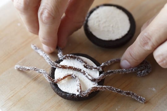 クリームサンドクッキーを開いて、細長い黒いグ ミを 下写真のように4 本並べて、元どおり に重ねて、足に見立てる。クッキーの上面に薄く切った丸いマシ ュマロを2つ並べて、中央にチョ コペンで目を描けば、キモかわい いクモのでき上がり。「細長い黒いグミは輸入菓子によくあるもの。KALDIで売 っている〝スクークス〞のコーラグミ を細長く切って使ってもOKです」