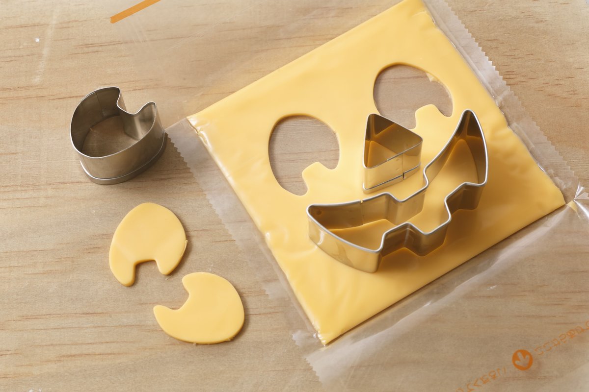 半分にカットしたバーガーバンズ の上に、レタスとハンバーグを重ねる。スライスタイプのチェダーチ ーズを、ジャックオーランタンの顔の抜き型で抜いて、ハンバー グにのせるだけ!「あつあつのハンバーグの上にのせれば、程よく 溶けてハンバーグ全体を覆えます。 オレンジ色のチェダーチーズなら、かぼちゃらしい色みに近づきますよ」