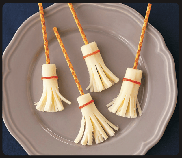 さけるチーズの下半分をフォークで回転させてさいた部分の幅が均等になるように4回くらいさく。反対側に軽く穴をあけ、プリッツをさしこむ。かにかまの赤い部分を巻きつけて、ホウキに見立てて、でき上がり!