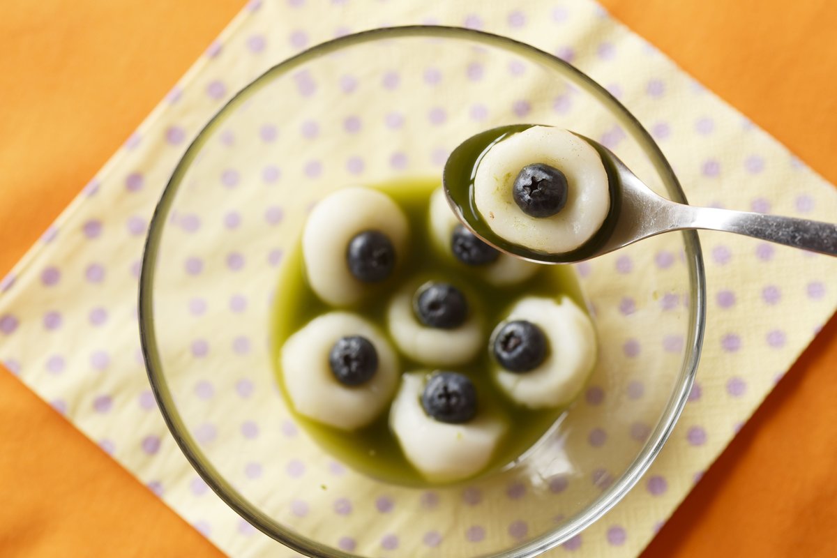 白玉粉に分量通りに水を加えてよく練って丸めて白玉だんごにする。それぞれ小指で真ん中に凹みをつける。たっぷりのお湯でゆでて、よく冷やす。写真下のように凹みにブ ルーベリーをのせれば、でき上がり。「ブルー ベリーのヘタがあるほうを上にすると目玉感がいっそうUPします」。抹茶シロップやあんこ、生クリームを合わせて和風スイーツにすると、おいしい。