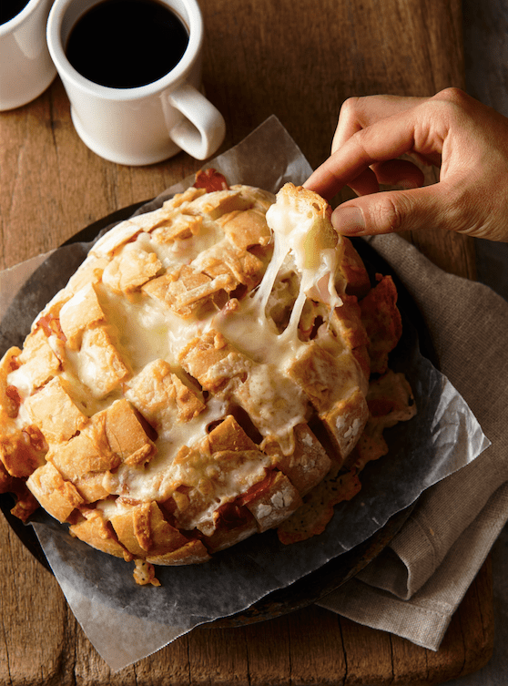 カンパーニュの切りこみにハムを詰めて、その上からピザ用チーズを詰めていく。