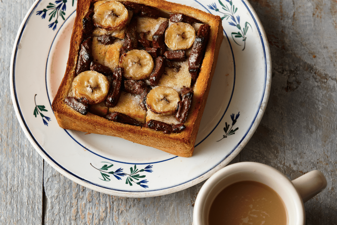 食パンの切りこみにバターを薄く塗り、板チョコレートを 手で割りながら詰めて、バナナを置く。
