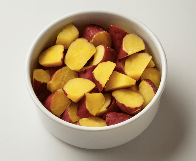 【ゆでさつまいも】 さつまいも・・・2本(約500g) さつまいもは皮つきのまま乱切りにし、水にさらしてアクをぬく。鍋に湯を沸かして竹串がスッと通るまでゆで、あら熱をとる。保存容器に入れる。