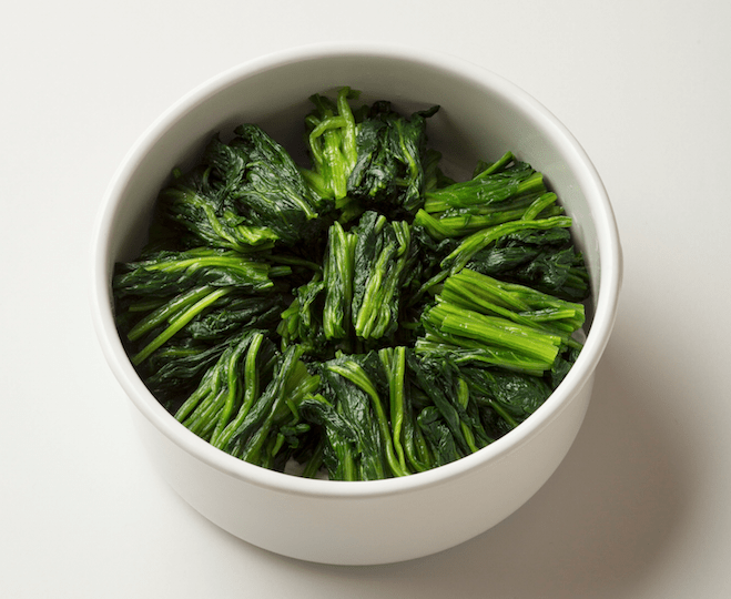 ほうれんそうは根をつけたままよく洗う。鍋に湯を沸かし、沸騰したら塩を入れる。ほうれんそうを根から入れてサッとゆでる。水にとり、水けをしっかり搾る。3㎝長さに切って、保存容器に入れる。