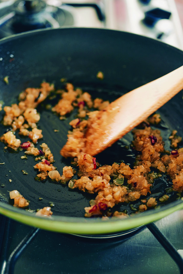 フライパンにサラダ油、赤唐辛子を入れて火にかけ、玉ねぎを中火で炒める。色づくまで7~10分炒めたら、にんにく、しょうが、トマトを加える。トマトの形がくずれてペースト状になるまでさらに炒める。