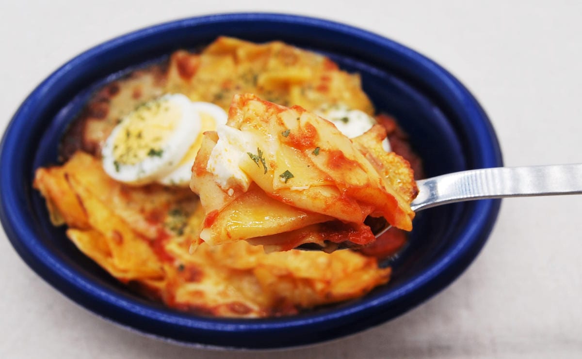 ローソン「ナポリ 4種チーズのラザーニャ風」濃厚ミートソースがもちもちパスタにとろ〜り絡む!