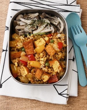 【厚揚げとツナのドライカレー】 フライパンにオリーブオイルを熱し、厚揚げと玉ねぎ、パプリカを入れて炒める。ツナとグリーンピース、酒を加えてサッと炒め、塩、カレー粉、ケチャップの順で加えてそのつどよく炒める。 ご飯に混ぜ合わせ、弁当箱に詰める。