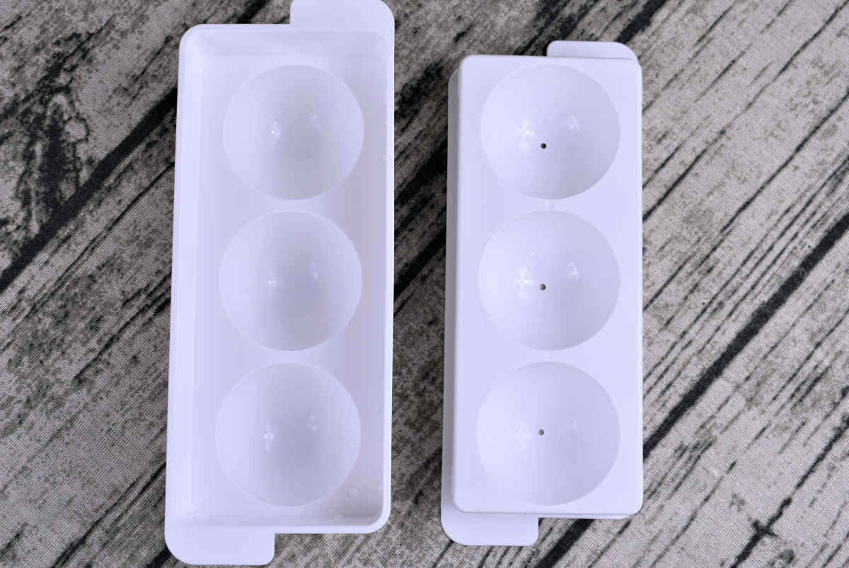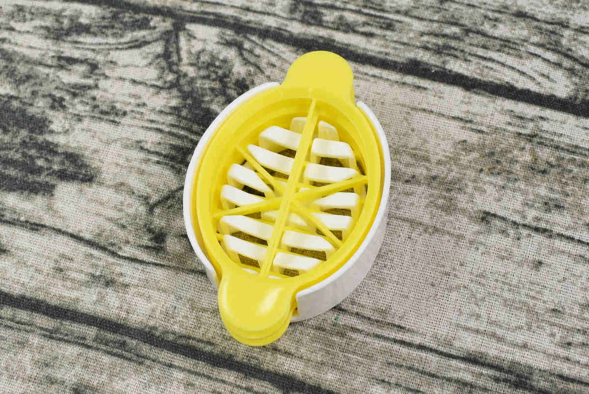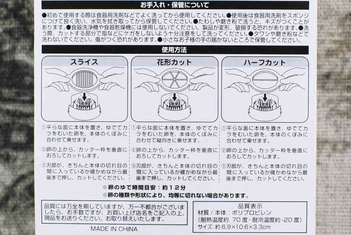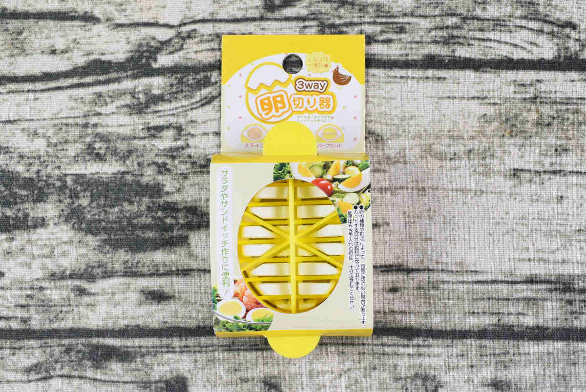スライスカッターの時と同じように、ゆで卵を横向きにセット。ゆで卵に「ハーフカット」のカッターを押しつけたところ、きれいに2分割されました。