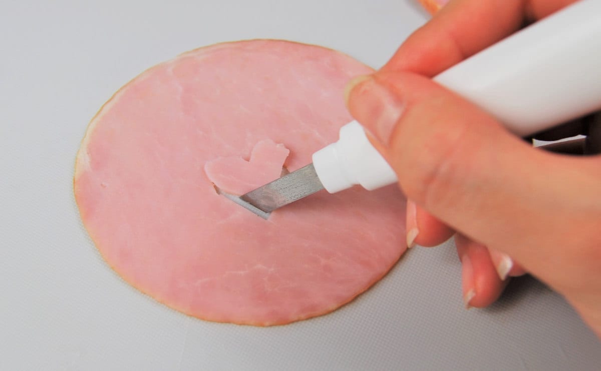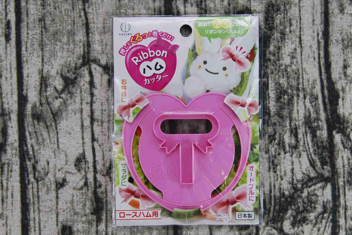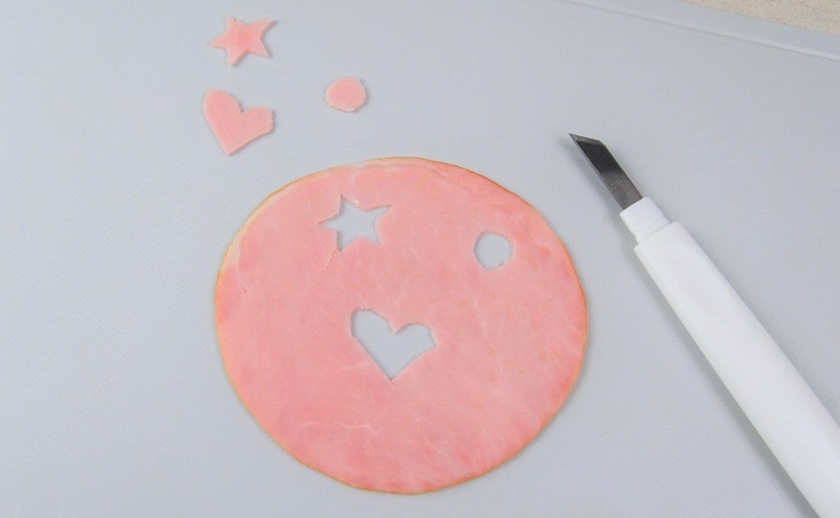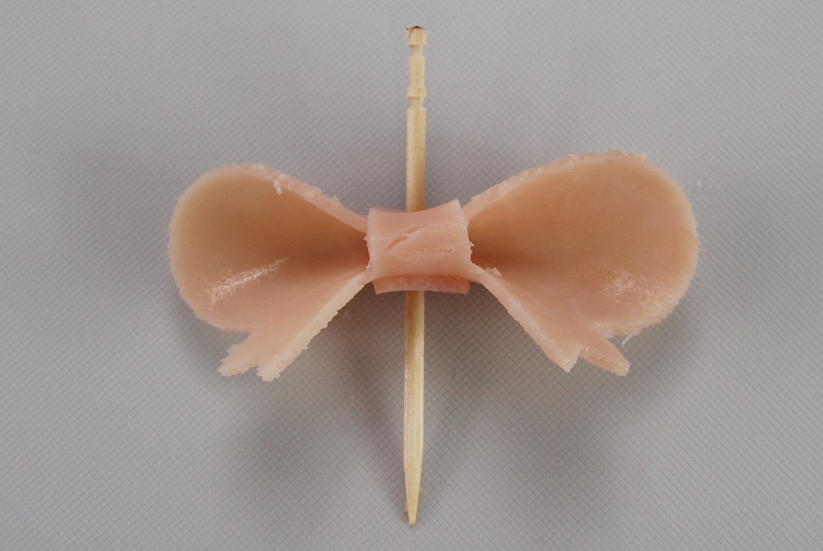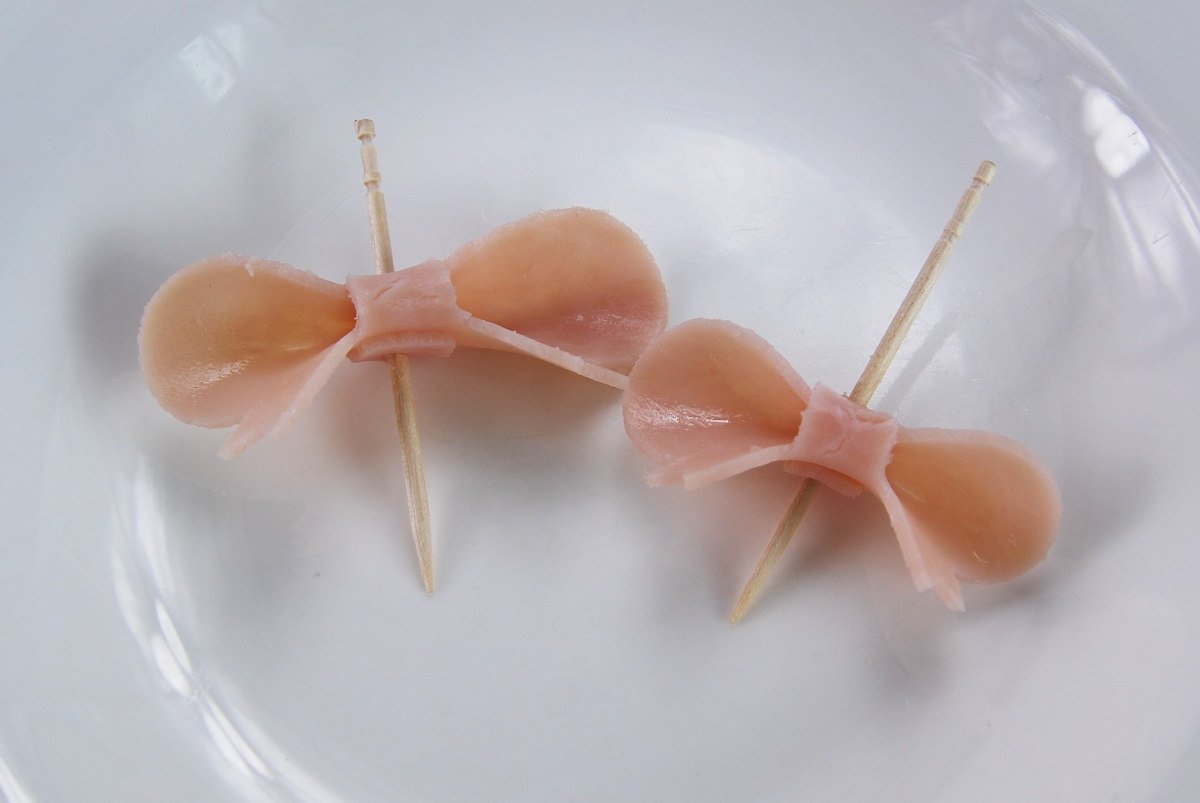 次に、細長く伸びた“象の鼻”部分を“顔”部分に巻きつけていきます。この時点でかなりリボン感が出てきましたが、最後に爪楊枝で固定すればできあがり。ハムのピンク色がリボンの形にマッチし、とても可愛らしい一品になりました。