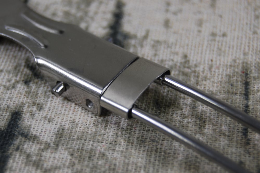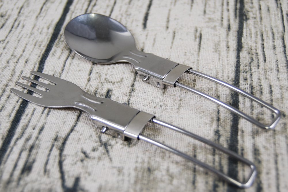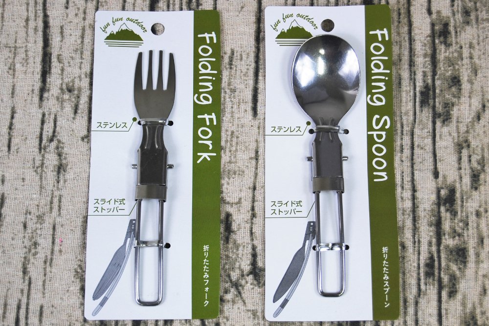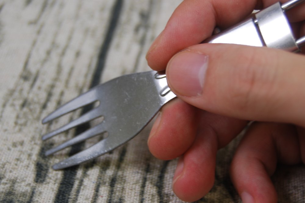 高級感あふれるシルバーカラーの「折りたたみフォーク」と「折りたたみスプーン」は、ミニサイズになる便利グッズ。持ち手の側の半分がフレームだけになっているので、一般的なスプーンやフォークと変わらない重さです。なのに、セリア「折りたたみフォーク&スプーン」は至って“頑丈”。渾身の力を込めて曲げてみましたが、形状は全く変化しませんでした。硬い食べ物でもなんなく取ることができそう!