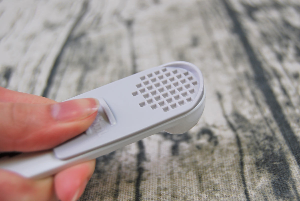 掴む部分は楕円形に窪んでいて、周囲が波打ったデザインになっています。卵のような立体的な食品も、窪みにハメれば掴みやすいですね。波状のデザインは滑り止めの役割を果たしていますが、1枚のステンレススチールでできているため洗いやすさもバッチリ。